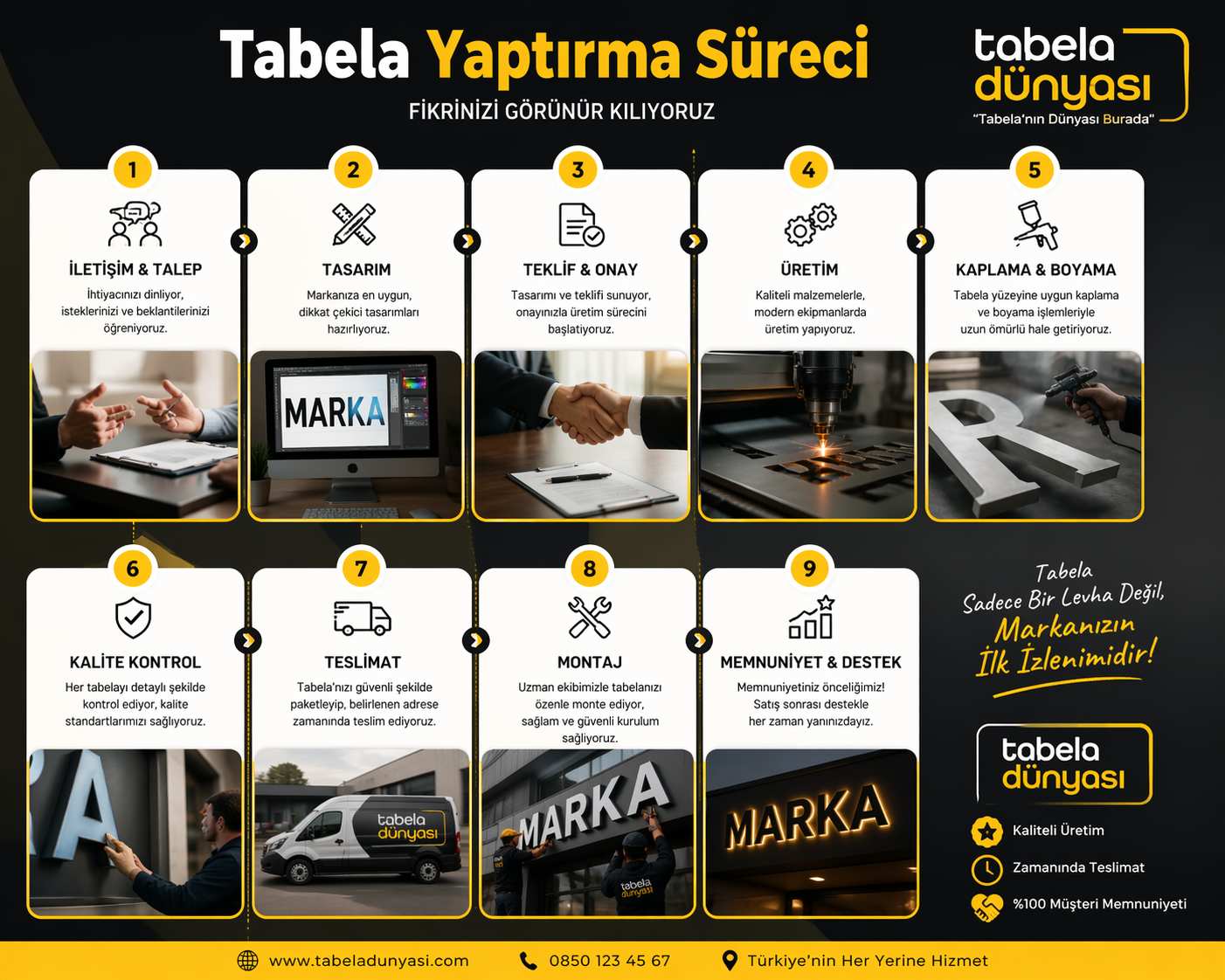 Bu aşamaya yardımcı olabilecek bağlantılı hizmet sayfaları için pleksi harf tabela, kabartma harf tabela ve ışıklı reklam panosu içerikleri incelenebilir.