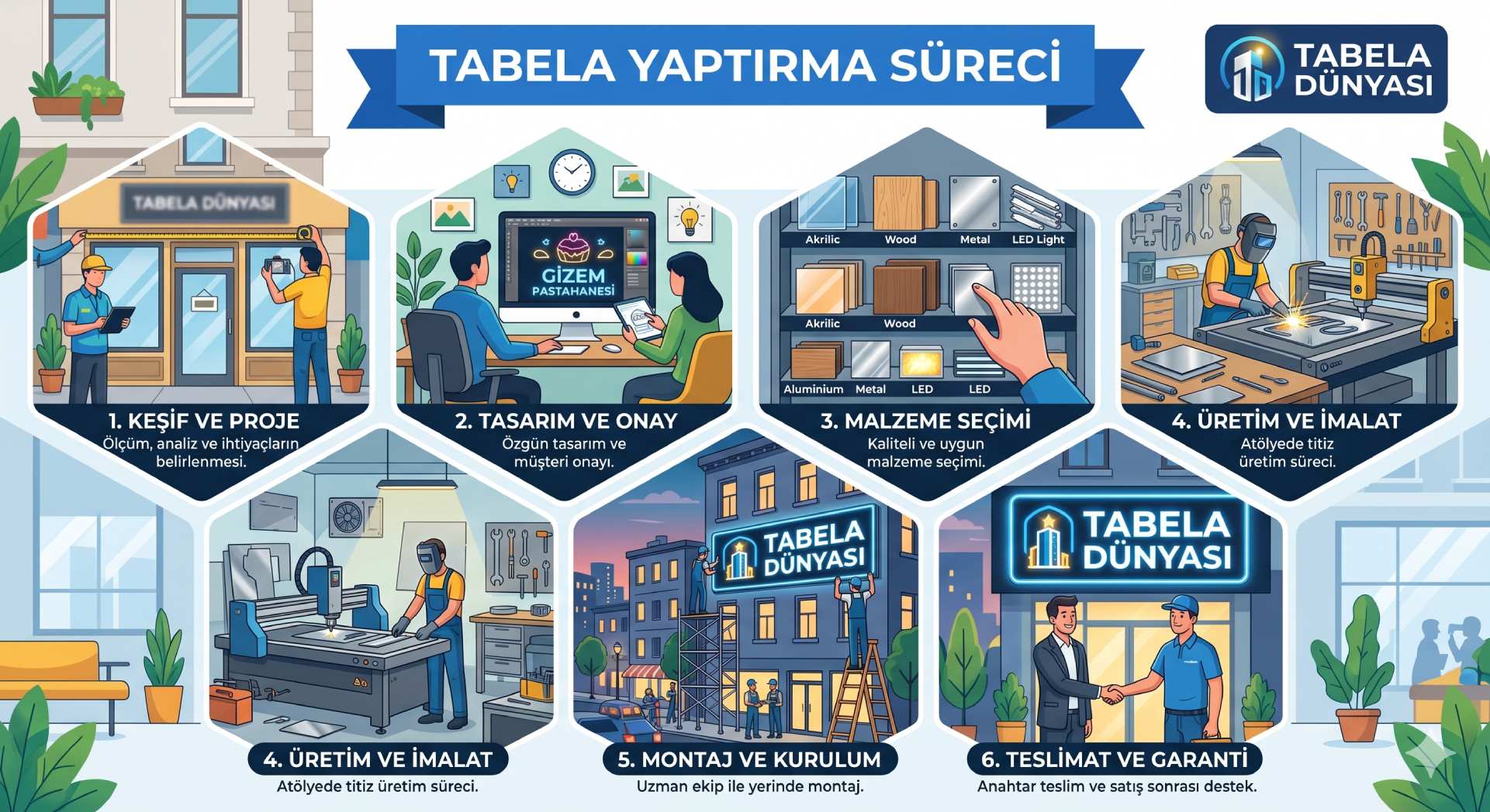 Tabela yaptırma süreci, dışarıdan bakıldığında yalnızca isim seçip duvara bir uygulama yaptırmak gibi görünebilir. Gerçekte ise bu süreç; keşif, ölçü, tasarım, malzeme seçimi, üretim, montaj ve son kontrol gibi birbiriyle bağlantılı aşamalardan oluşur. Bu aşamalar düzgün planlandığında ortaya hem güçlü görünen hem de uzun süre sorunsuz kullanılan bir sonuç çıkar.